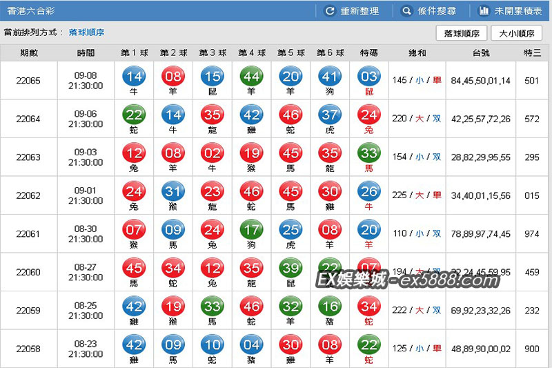 每到周二、四、六或日的晚間21:30分,就是彩迷們最緊張又刺激的時刻,將決定下注的六合彩號碼是否有機會讓自己賺一筆收入,EX娛樂城同步官方開獎結果公信力絕對足夠,查詢六合彩即時開獎號碼只要進入專區就有最新紀錄,所以就算玩家沒有跟上直播也不用再等上大半天,一樣可以用最快速度知道有沒有中獎,並且EX娛樂城按照冷熱門號、尾數、單雙、大小等分類,統計出對玩家有利的參考數據,查詢免等待、資訊最齊全的六合彩平台還不趕緊收藏!