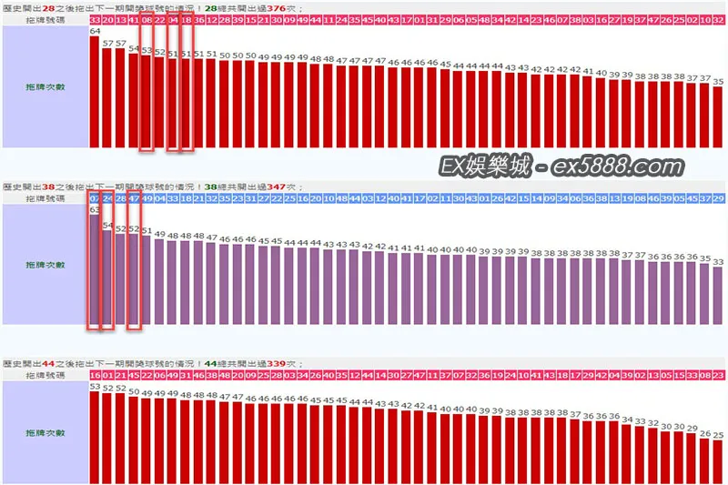 第二招是熱門號搭配拖牌結果來看,拖牌結果指的就是統計歷史大數據得出,哪些號碼開出之後緊接著會開的又是哪些號碼,拖牌在google同樣可以查詢,熱門號碼為08、46、11、24、31、38、07、04、30、14、17、18、47,而拖牌結果超過50次以上並符合熱門號的則有07、30、38、18、04、08、47、24,和熱門號+熱門尾數所抓出來的號碼重複率還是很高的。