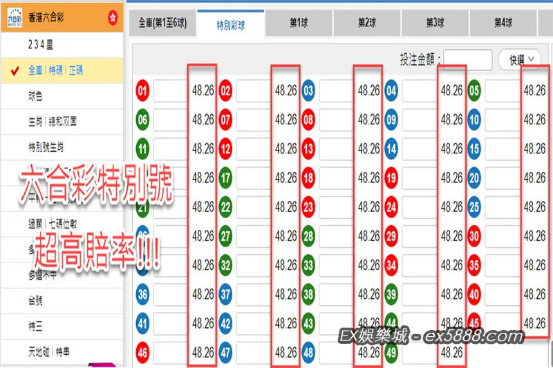 六合彩特別號多少錢?既然都要跟大家分享了,小編就以最優惠的投注管道「九州集團-娛樂城」來做為計算例子,你可以下注最低10塊錢來賭六合彩特別號贏獎金的機會,就算只下注10塊也能贏得482塊的獎金,因為娛樂城給出高達48.26的六合彩特別號賠率,當然下注越高的成本贏得的獎金就會更多~