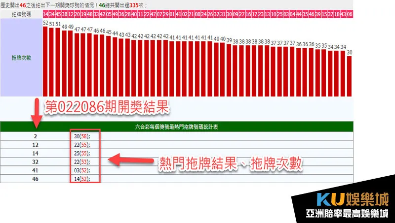 第二階段呢就是分析拖牌結果,以第022086期做為主要目標,30、22、25、22、03、14,就是第二階段所分析的重點號碼,通常會依據最熱門的拖牌號碼或是超過50次拖牌次數的號碼為主。